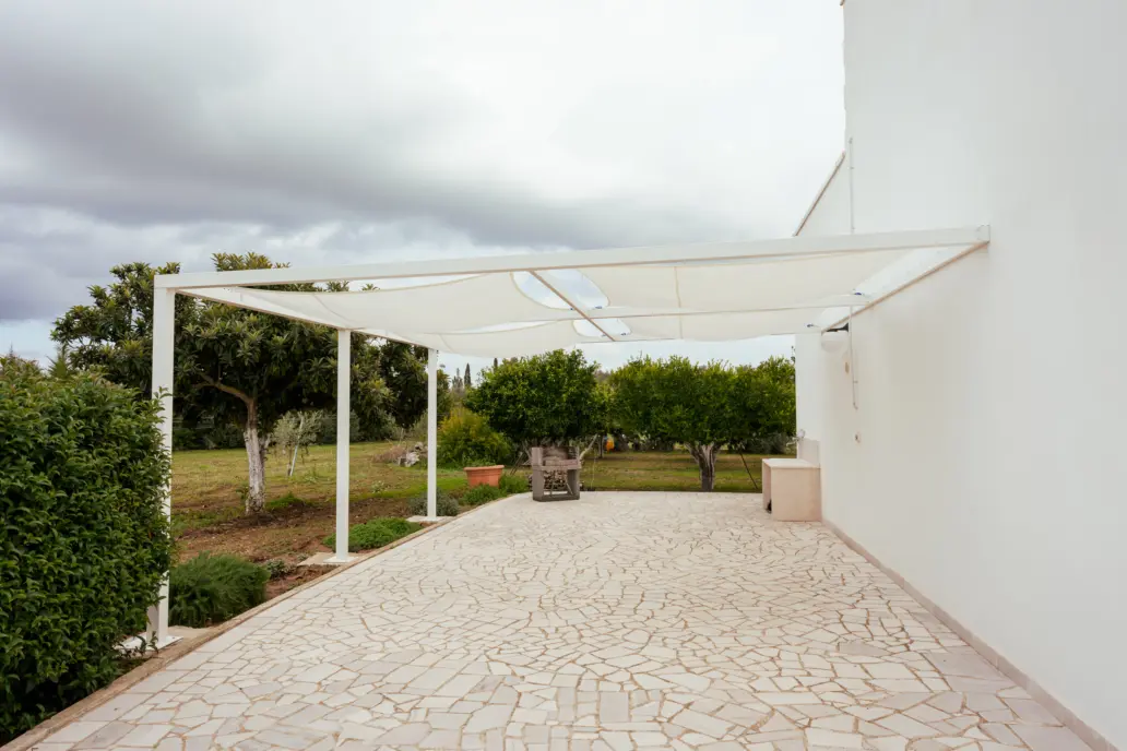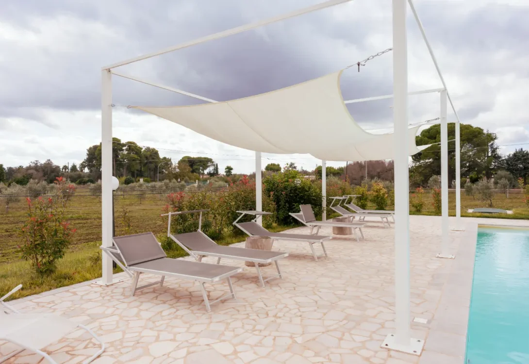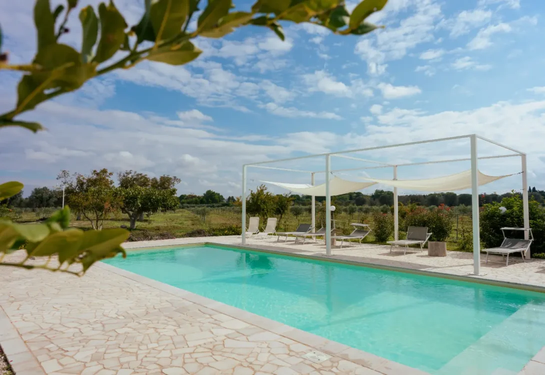 Intorno, un panorama che incanta: distese di ulivi che sfumano nell’orizzonte, agrumi che profumano l’aria e una piscina in pietra naturale che riflette il cielo del Salento. Tutto è essenziale e autentico: luce, vento, acqua e silenzio.