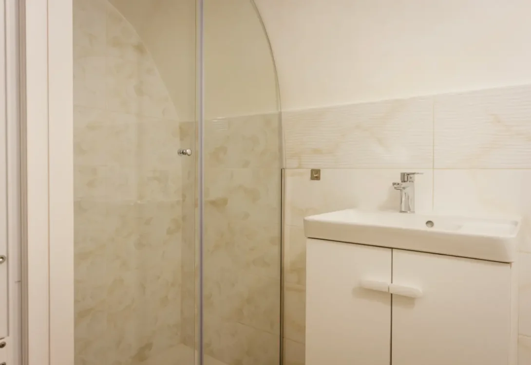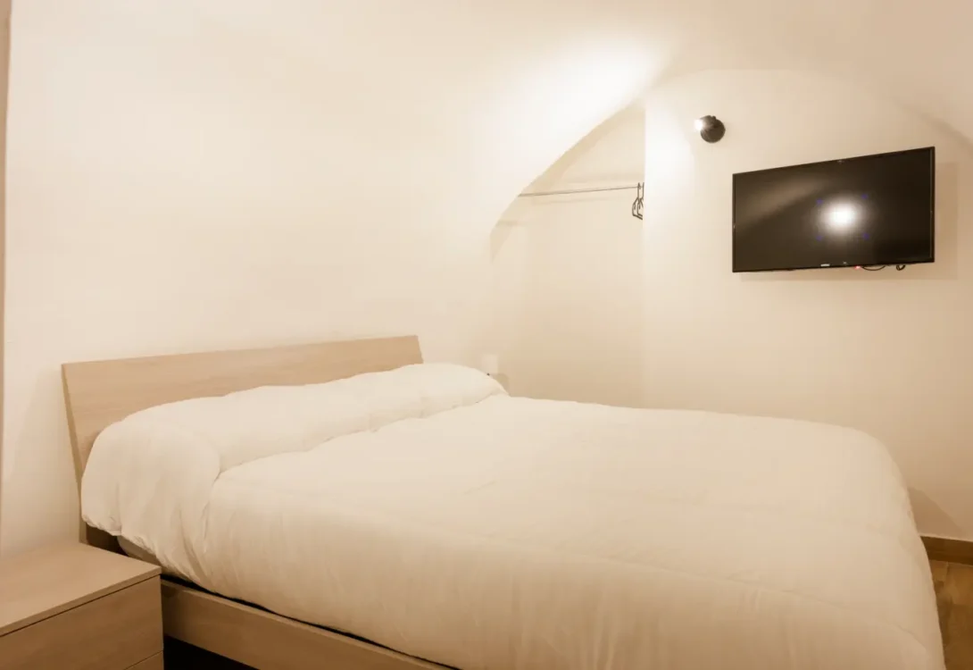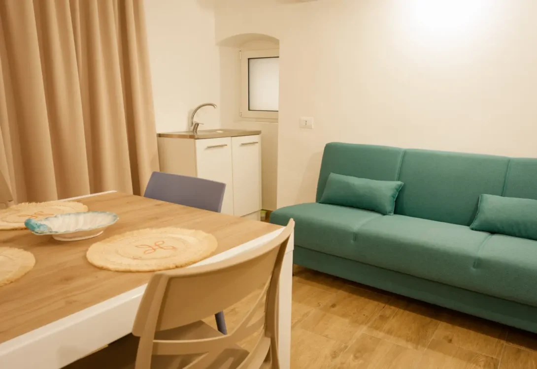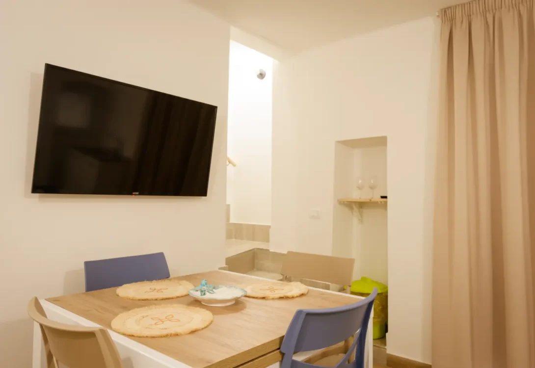 I materiali naturali – calce, pietra, legno locale – dialogano con l’anima del luogo senza sovrastarla. Le stanze, luminose e curate, uniscono linee contemporanee e dettagli antichi: letti in legno chiaro, tessuti naturali e atmosfere intime che invitano alla quiete.